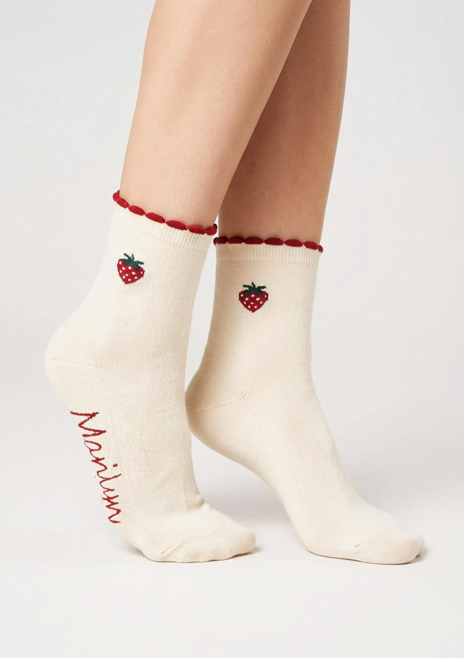 Baumwollsocken verbinden den Komfort des täglichen Tragens mit einem charmanten, sorgfältig ausgearbeiteten Detail. Das glatte Gestrick wurde auf beiden Seiten mit einer gestickten Erdbeere verziert, während der gewellte Abschluss am Bündchen dem Ganzen einen leichten, mädchenhaften Charakter verleiht. An der Fußsohle befindet sich ein eingestickter Marilyn-Schriftzug, der das Markendetail des Modells dezent unterstreicht. Dieses angenehm zu tragende Modell bringt einen Hauch von Farbe und unbeschwertem Charme in jede Styling-Kombination.