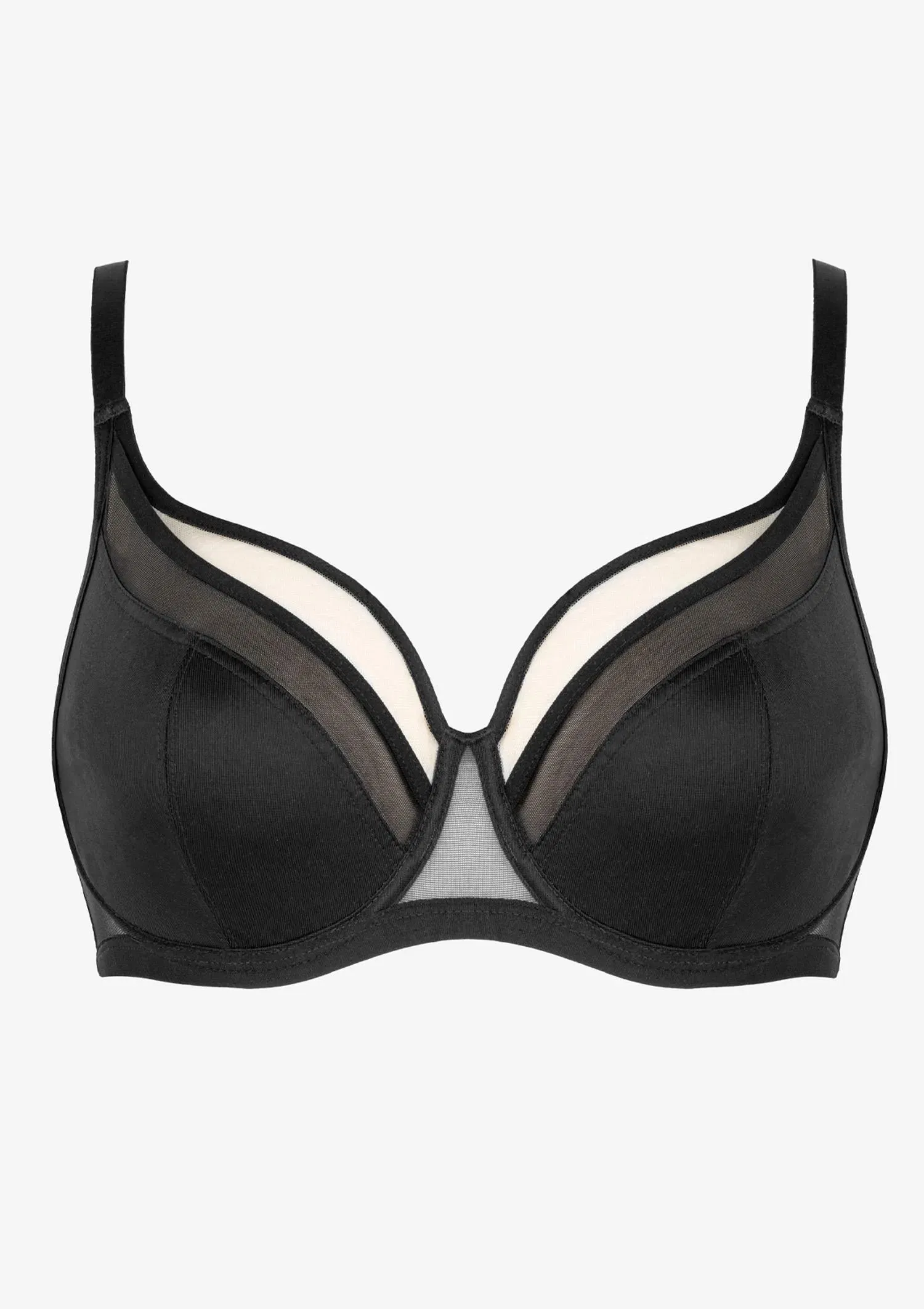 Der BH wurde für Frauen mit größerer Oberweite entworfen, die modernes Design und zuverlässigen Halt schätzen. Gefertigt aus einer Kombination von schwarzem, stabilem Simplex und transparentem Tüll in zwei Farbtönen – Schwarz und Hautfarbe – entsteht ein futuristischer Look in minimalistischer Form. Die Cups mit doppeltem Unterbrustband und präzisem Schnitt heben und formen die Brust perfekt. Transparente Einsätze im oberen Cup-Bereich, am Mittelsteg und am Rücken verleihen dem Modell Leichtigkeit, während breite, weiche Bänder für ganztägigen Tragekomfort sorgen. Glatte, verstellbare Träger und feste Seitenteile aus Tüll bieten Stabilität und eine ideale Passform. Ein Soft-BH mit architektonischer Linie, der moderne Ästhetik mit Funktionalität verbindet.